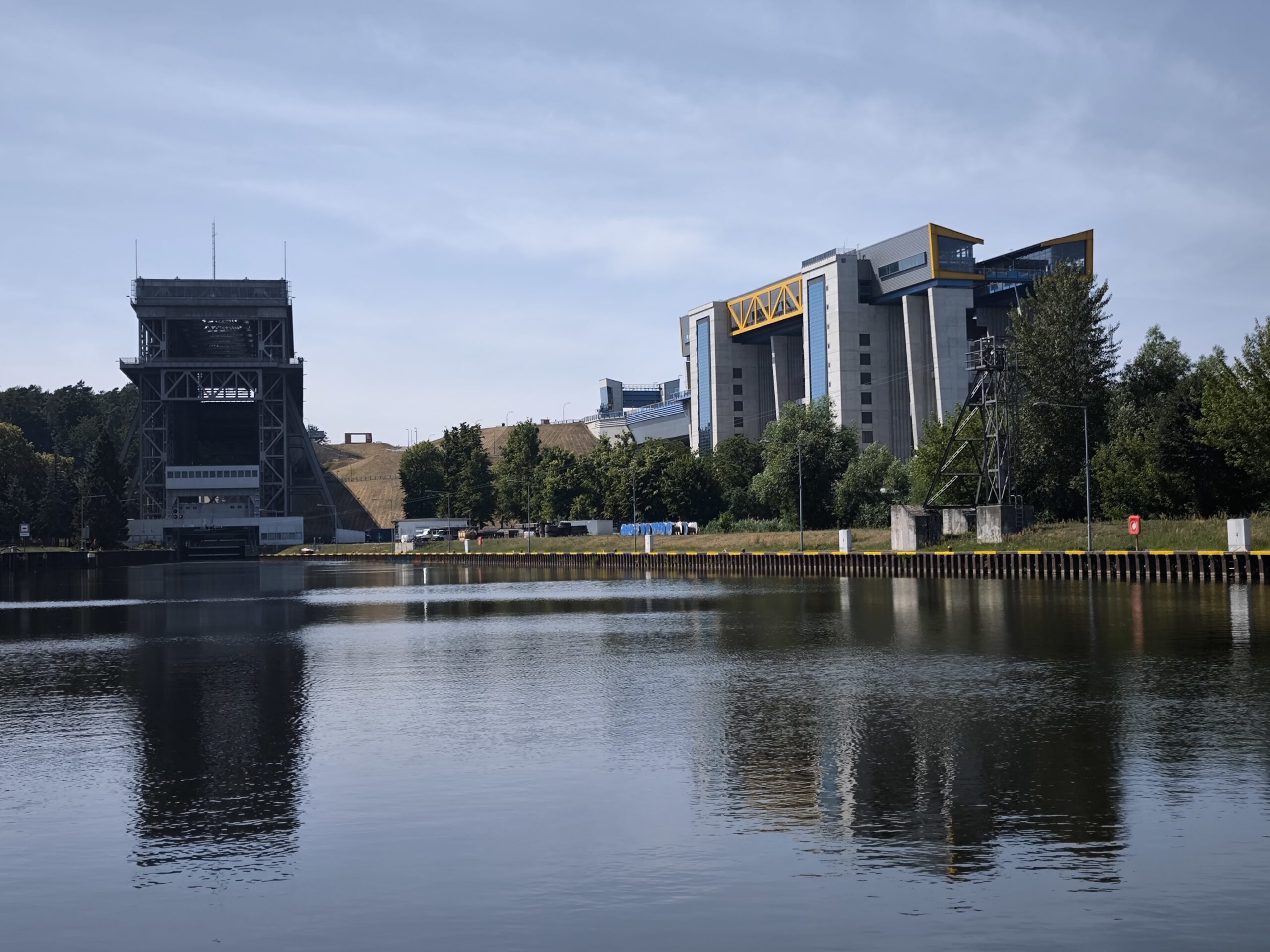 Zurück auf der MS Chopin schnell an Deck, um das nächste Highlight nicht zu verpassen. Wir fahren in das neue Schiffshebewerk von Niederfinow ein, das seit 2022 in Betrieb ist und das direkt neben dem alten Schiffshebewerk (ab 1934 in Betrieb) liegt. Alle Schiffe – vom Ausflugsboot bis zum Containerriesen – manövrieren hier in eine Art Badewanne hinein und werden wie im Fahrstuhl nach oben oder unten befördert. In nur wenigen Minuten überwinden sie so das Niveau von 36 Metern zwischen Havel und Oder.