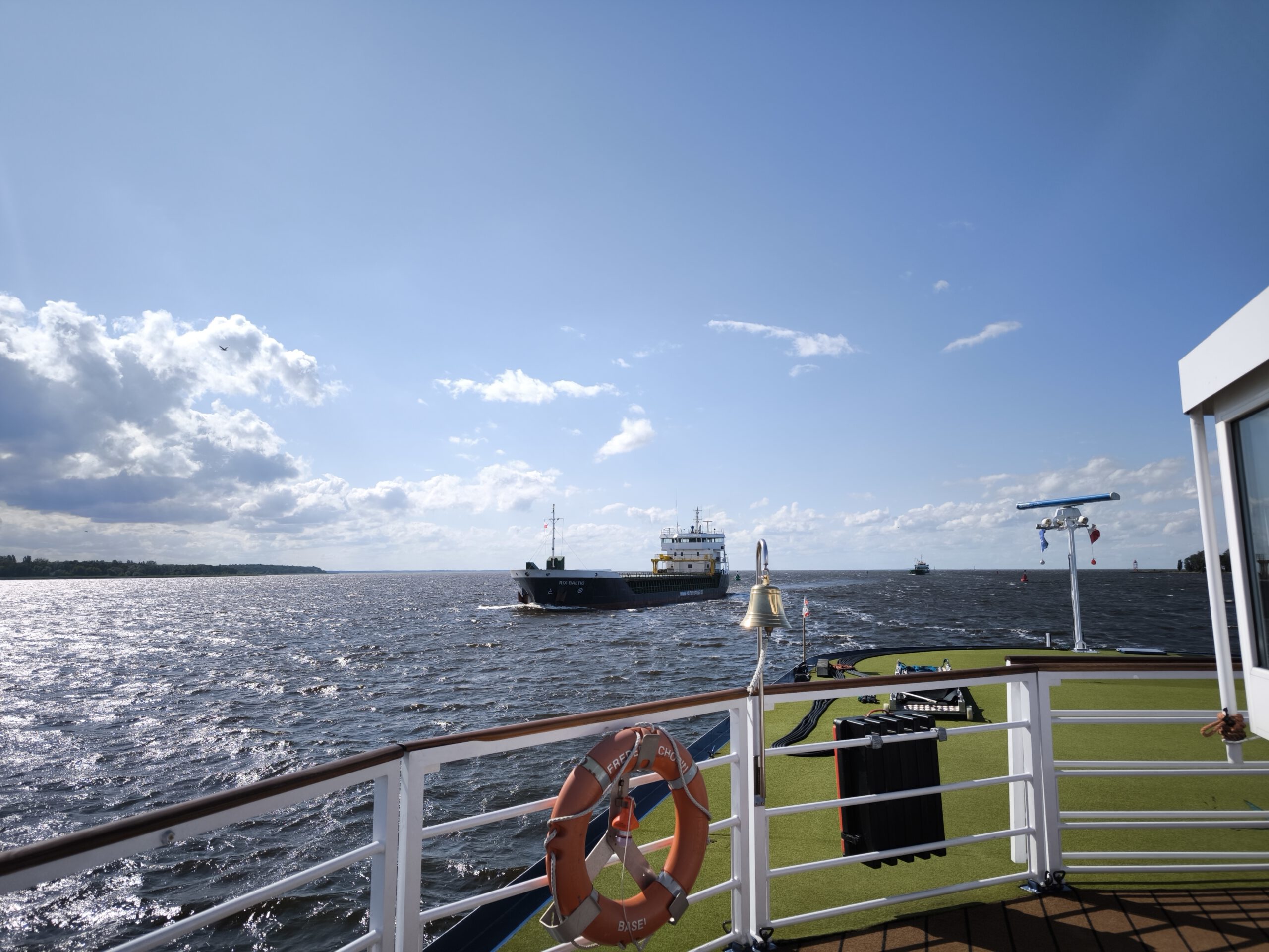 Das Stettiner Haff, eine große Lagune abgeriegelt gegen die Ostsee durch die Inseln Usedom und Wolin, misst kaum vier Meter Tiefe und ist für größere Schiffe nur über eine ausgebaggerte Fahrrinne passierbar. „Der Wasserstand ändert sich im Haff kaum. Das ist nicht wie auf anderen Flüssen. Aber der Wind und die Sandbänke sind das Problem. Sie wandern und die Fahrrinne muss neu angepasst werden“, erklärt der Kapitän und fügt an „Sicherheit geht vor. Ich habe die Verantwortung für Passagiere, Crew und Schiff.“