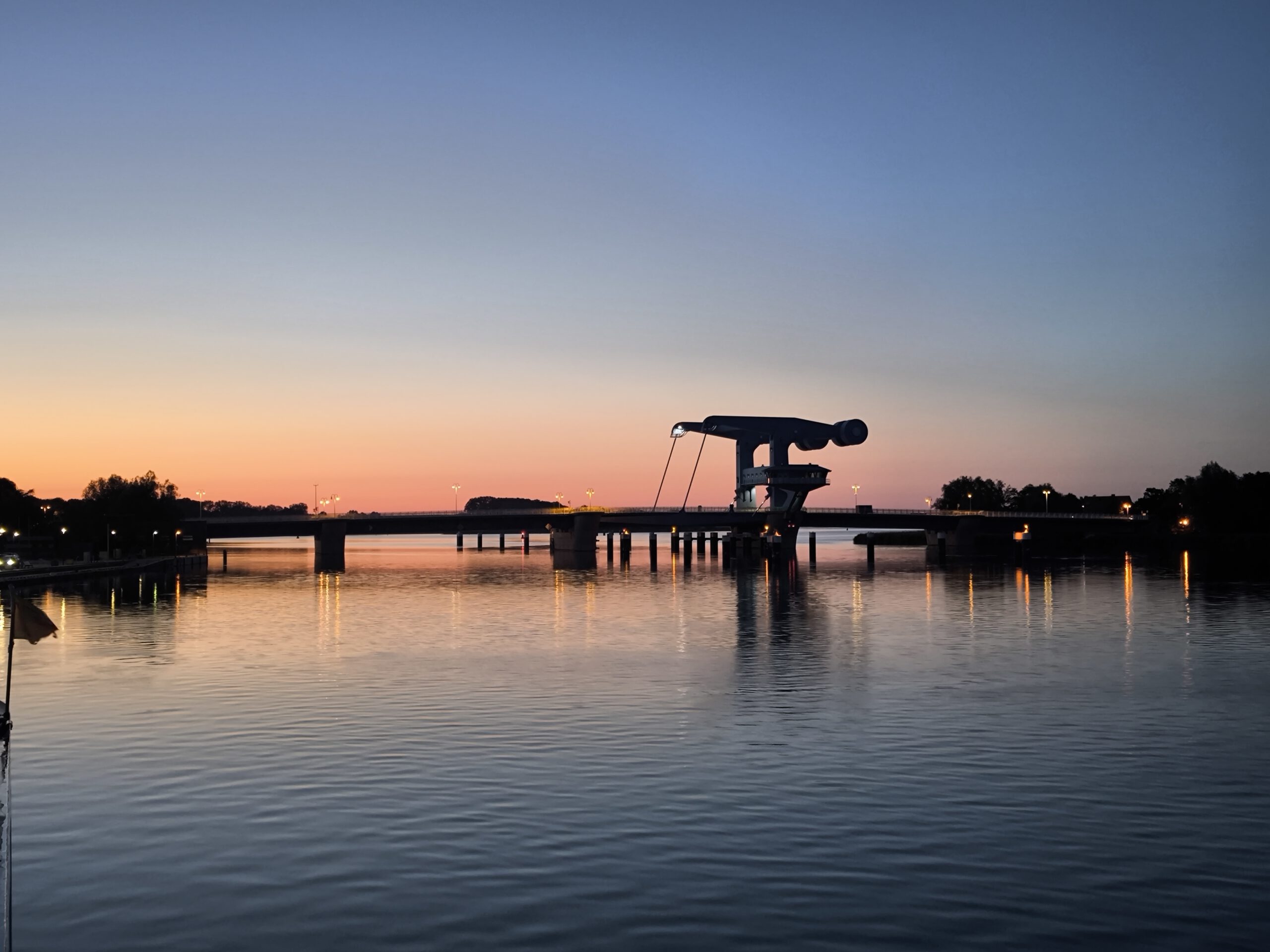 - Romantische Ausblicke an Bord: die Klappbrücke das „Blaue Wunder“ – das „Tor“ zur Insel Usedom um Mitternacht