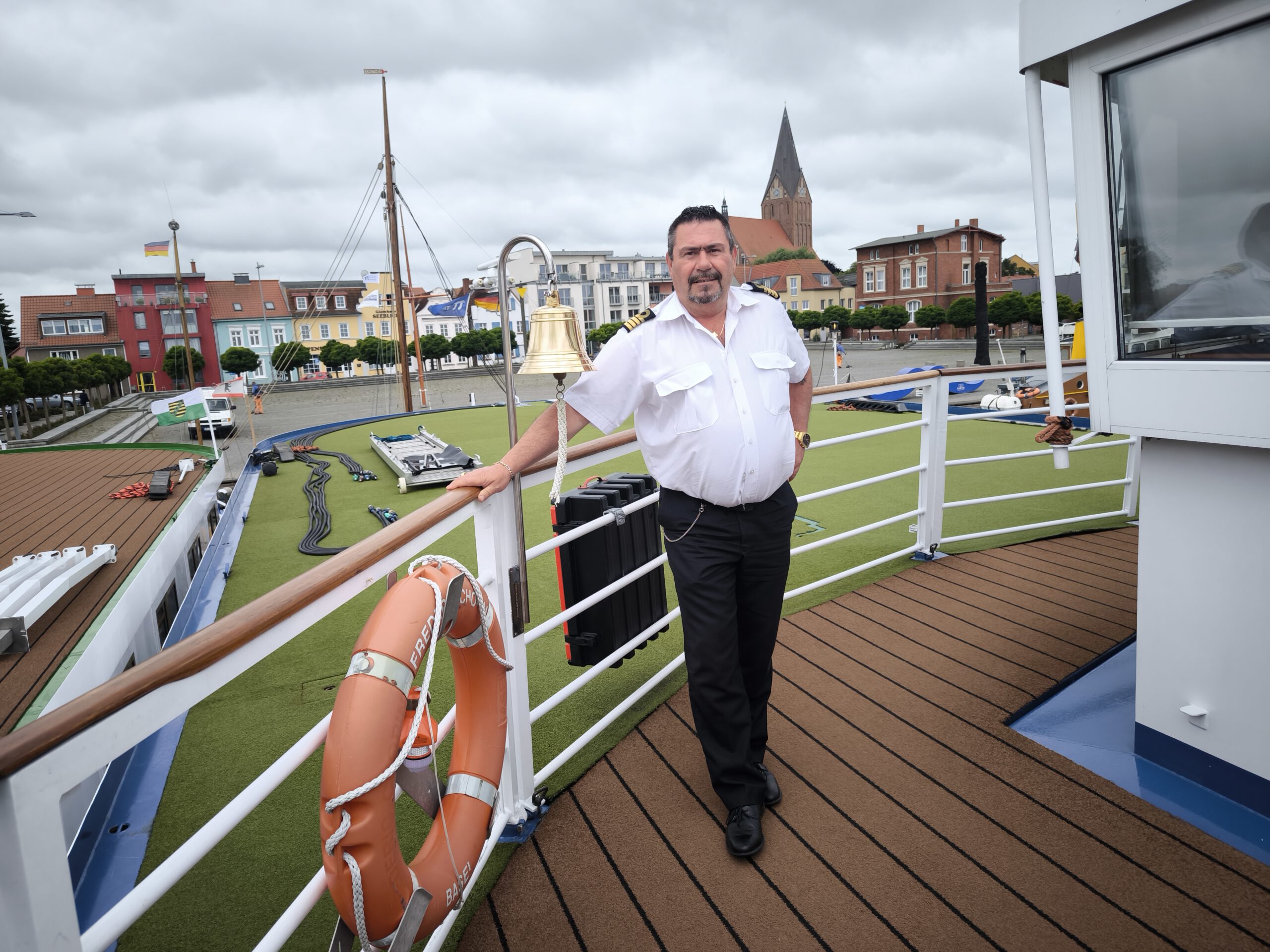 Mittlerweile bläst ein starker Wind und Regenschauer fallen vom Himmel. Kapitän Weinstein muss eine nicht seltene Ansage machen. Auf dem Haff tobt ein Sturm mit acht Beaufort Windstärke. Das ist zu viel für ein Flusskreuzfahrtschiff. „Bis sechs Beaufort können wir unter Umständen fahren, aber auch nur, wenn der Wind nicht von der Seite kommt und uns aus der Fahrrinne treibt“, sagt der 60-jährige Tscheche.