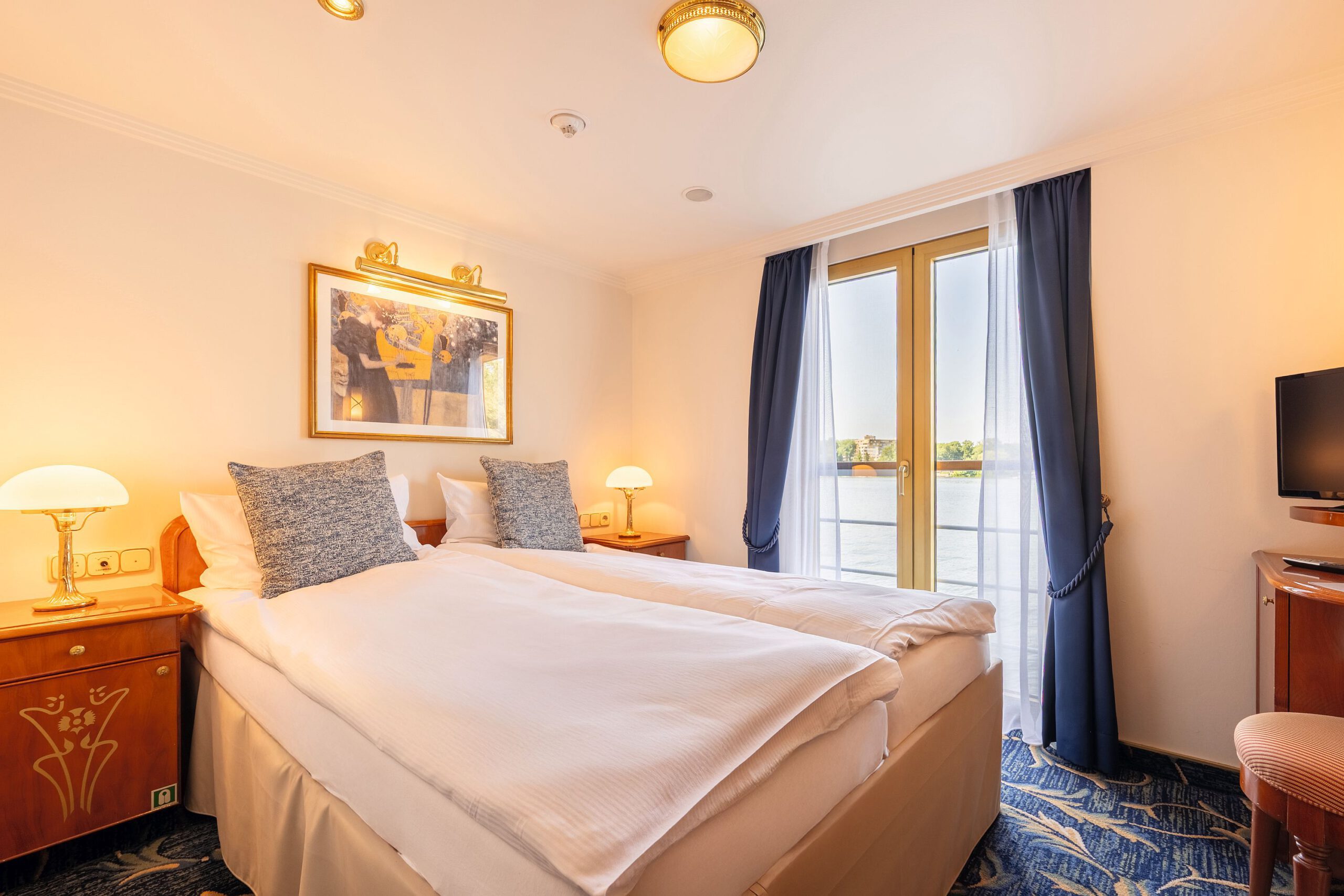 - Die Doppelkabinen mit schön gefliestem Bad und französischem Balkon sind im nostalgischen Belle-Epoque-Stil eingerichtet und lassen keine Wünsche offen