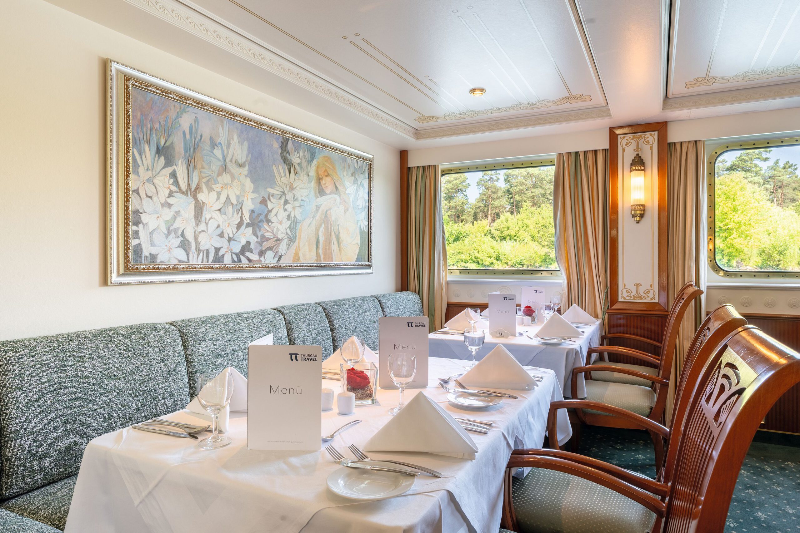 - Das Restaurant des Boutique-Schiffs ist im Belle-Epoque-Stil eingerichtet. Man sitzt elegant und gemütlich bei feinem Essen und gutem Service